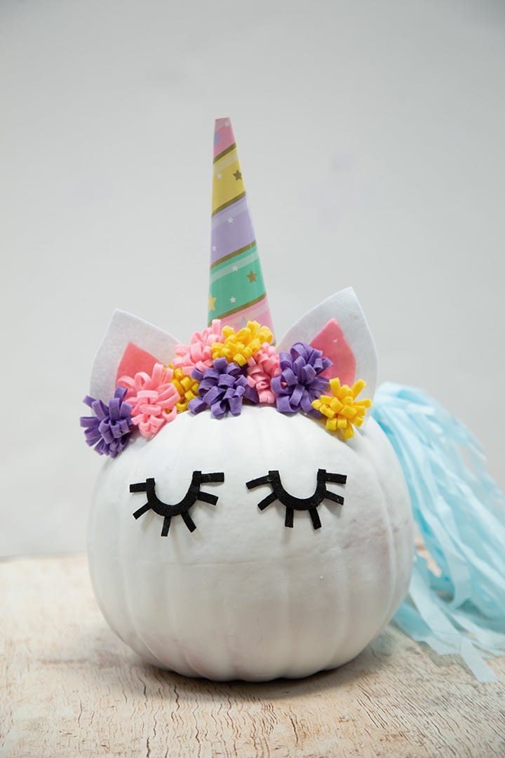 It’s no drama llama. Painted nicely with a plain white skin, the pink flowers on top and bottom adds more beauty to it. On top of it is some white fluff which can be white flowers or any decorative white tissue paper to cover up the stalk of the pumpkin. The ears can be made out of paper cuttings. As for the facial features, don’t forget to draw a cute face with a marker.